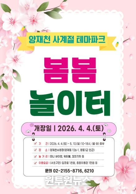전성수 서초구청장은 “겨울철 눈썰매장으로 운영되던 양재천 공간을 봄철에는 온 가족이 즐길 수 있는 놀이공간으로 조성했다”며 “계절마다 다양한 즐길거리를 제공하는 양재천에 많은 가족들이 방문해 즐거운 시간을 보내길 바란다”고 말했다.