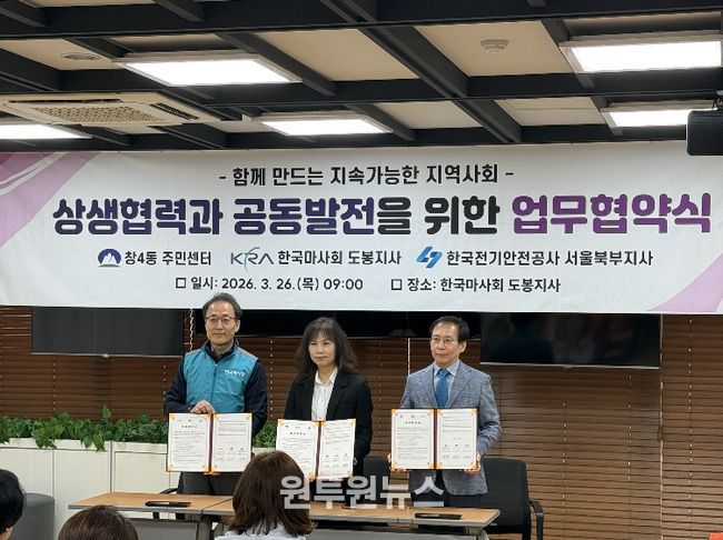 (원투원뉴스) 서울 도봉구 창4동은 지난 3월 26일 한국마사회 도봉지사 1층 전자카드센터에서 한국마사회 도봉지사, 한국전기안전공사 서울북부지사와 ‘함께 만드는 지속가능한 지역사회 상생협력과 공동발전’ 업무협약을 체결했다.