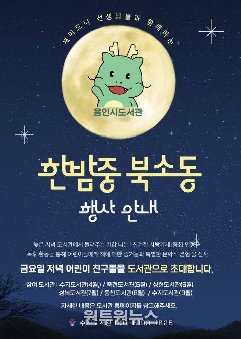 (원투원뉴스) 용인특례시 서부도서관은 수지‧죽전‧상현‧성복‧동천도서관에서 야간 독서문화 프로그램 ‘한밤중 북소동’을 운영한다고 25일 밝혔다.