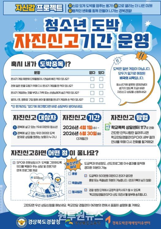 (원투원뉴스) 경북교육청은 6월 30일까지 3개월간 경북경찰청, 경북도박문제예방치유센터와 함께 ‘청소년 도박 자진신고 기간’을 운영한다고 2일 밝혔다.