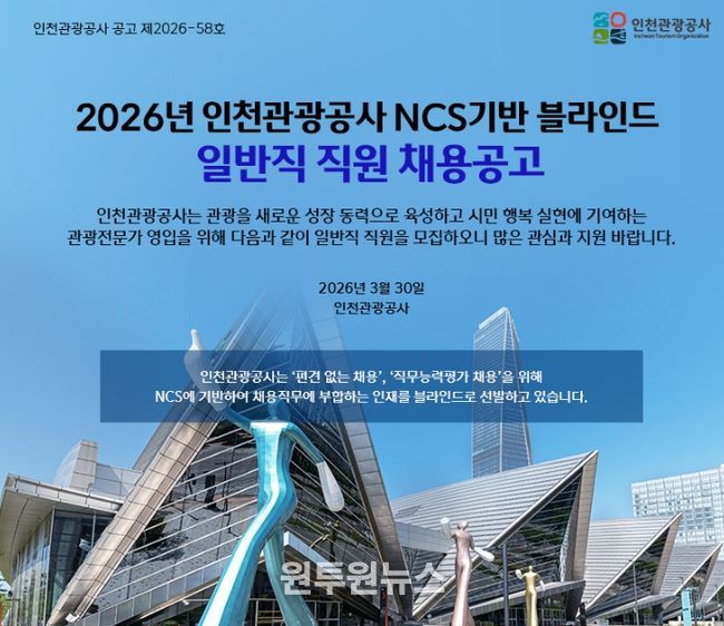 (원투원뉴스) 인천관광공사(사장 유지상)는 2026년도 신규직원 공개채용을 위한 원서접수를 오는 4월 13일까지 진행한다고 밝혔다.