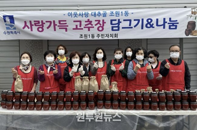 (원투원뉴스) 수원시 장안구 조원1동 주민자치회는 지난 1일, 복지행정분과 주관으로 ‘사랑가득 고추장 담그기’ 행사를 열고, 직접 담근 고추장을 관내 취약가구 200여 세대에 전달했다.