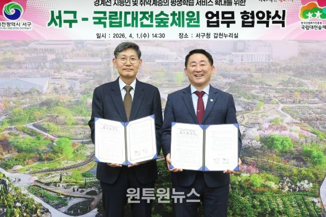 (원투원뉴스) 대전 서구 평생학습원은 국립대전숲체원과 경계선 지능인 산림교육 평생학습 활성화를 위한 업무 협약을 체결했다고 2일 밝혔다.