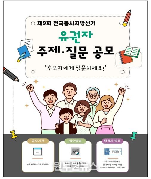 (원투원뉴스) 중앙선거방송토론위원회는 제9회 전국동시지방선거 후보자토론회에서 토론주제와 질문사항 선정에 활용하기 위해 4월 6일부터 ‘유권자 주제·질문 공모’를 실시한다고 밝혔다.