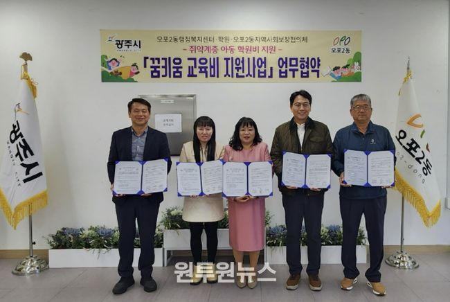 오포2동 지역사회보장협의체는 지난달 31일 취약계층 아동의 교육 격차 해소를 위해 지역 내 학원과 ‘꿈 키움 교육지원 사업’ 업무 협약식을 맺었다.