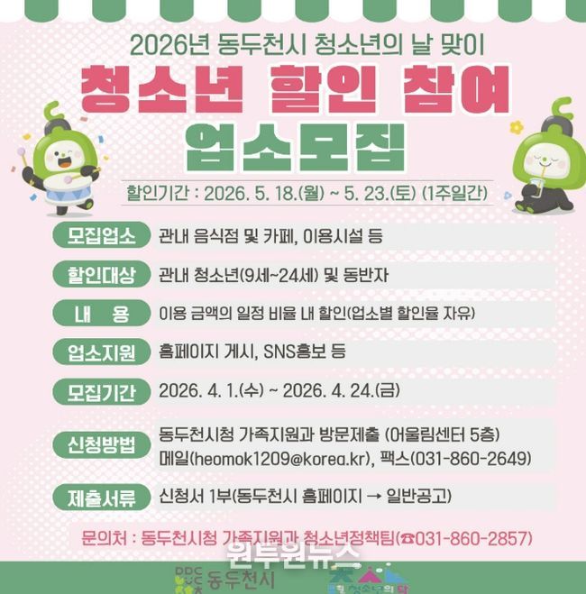 (원투원뉴스) 동두천시는 오는 5월 청소년의 날을 맞이하여 청소년 복지를 증진하고 지역경제를 활성화하기 위해 오는 5월 18일부터 5월 23일까지 6일간 ‘청소년 할인 주간’을 운영한다.
