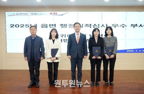 (원투원뉴스) 홍천군은 4월 2일 홍천군청 대회의실에서 2025년 읍면별 군정 주요 업무에 대한 행정 실적 심사 우수 읍면에 상장을 수여했다.