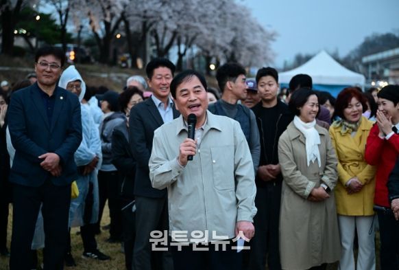 행사는 저녁 6시 보건소에서 운영하는 건강 증진 홍보 부스 설치로 시민들의 큰 호응을 얻었으며, 이어 저녁 7시 직지사천을 수놓는 경관조명 점등식이 시작되어 시민들은 환하게 불을 밝힌 벚꽃 터널 아래를 가족, 친구, 연인과 함께 걸으며 봄밤의 낭만을 즐겼다.