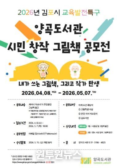 (원투원뉴스) 김포시 양곡도서관은 2026년 김포시 교육발전특구 사업의 일환으로 시민 작가를 발굴하고 유아 독서교육의 기반을 마련하기 위해 ‘시민 창작 그림책 공모전’을 개최한다.