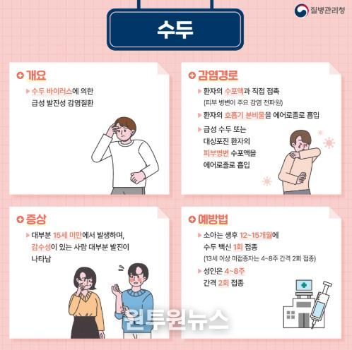 수두와 유행성이하선염은 환자가 기침할 때 나오는 침방울 등 호흡기 분비물을 통해 전파되는 대표적인 감염병이다.