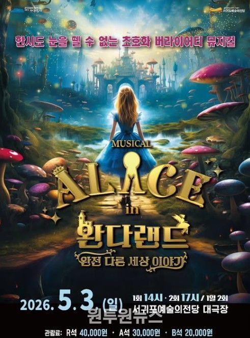(원투원뉴스) 서귀포예술의전당은 5월 가정의 달을 맞아 뮤지컬 '이상한 나라의 앨리스: 완다랜드'를 5월 3일 오후 2시와 5시, 총 2회에 걸쳐 서귀포예술의전당 대극장에서 선보인다.