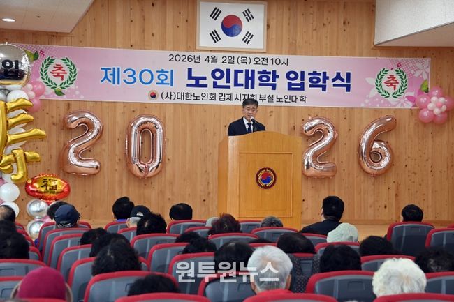 (원투원뉴스) 김제시는 대한노인회 김제시지회가 2일 지회 2층 강당에서 노인대학생 및 관계자 등 약 220명이 참석한 가운데 '2026학년도 제30회 노인대학 입학식'을 개최했다고 밝혔다.