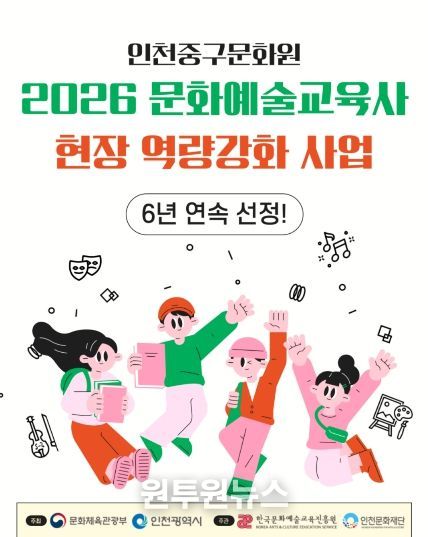 (원투원뉴스) 인천중구문화원(원장 박봉주)이 문화체육관광부와 인천광역시가 주최하고, 인천문화재단 인천문화예술교육지원센터와 한국문화예술교육진흥원이 주관하는 '2026 문화예술교육사 현장 역량강화 사업(인천)'에 6년 연속 선정되는 쾌거를 달성했다.