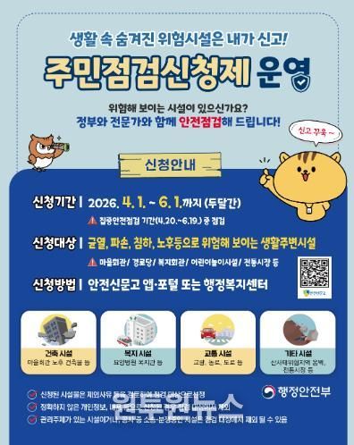 (원투원뉴스) 고성군은 2026년 집중안전점검 기간(4월 20일~6월 19일) 동안 군민이 직접 참여하는'2026년 집중안전점검 주민점검신청제'를 운영한다고 밝혔다.