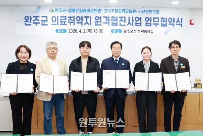 군은 2일 군청에서 참좋은삼례내과의원, 고려가정의학과의원, 고산성모의원 등 민간 의료기관 3개소와 ‘의료 취약지 원격 협진 시범 사업’ 추진을 위한 업무 협약을 체결했다.