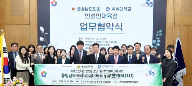 충남도의회는 2일 백석대 본부동에서 홍성현 의장과 백석대 송기신 총장 등 양 기관 관계자들이 참석한 가운데 ‘인성인재양성 협력을 위한 업무협약’을 체결했다.