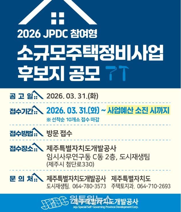 (원투원뉴스) 제주특별자치도와 제주특별자치도개발공사(사장 백경훈)는 대규모 정비사업 추진이 어려운 노후 주거지의 환경을 개선하고, 양질의 주택공급을 확대하기 위해 작년에 이어 올해에도 ‘JPDC참여형 소규모주택정비사업 신규 후보지 발굴 공모’를 실시한다고 밝혔다.