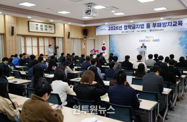 (원투원뉴스) 광주시교육청은 2일 본청 대회의실에서 고위 공직자를 포함해 모든 직원을 대상으로 ‘2026년 청탁금지법 등 부패방지교육’을 실시했다.