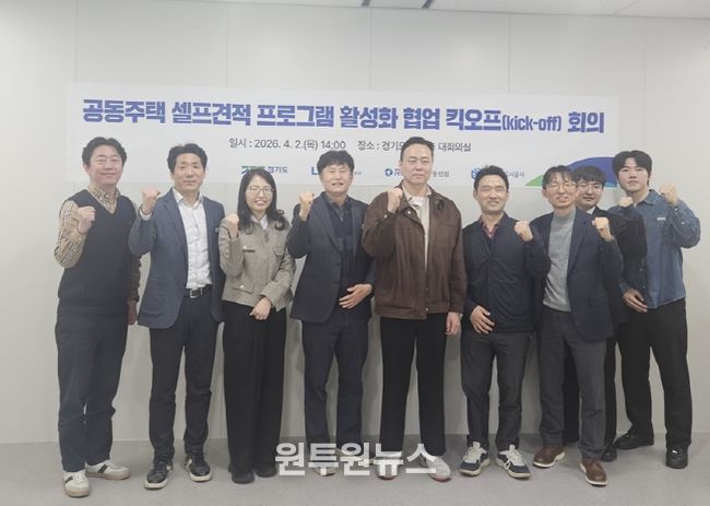 경기도는 4월 2일 경기도청에서 중앙공동주택관리지원센터(한국토지주택공사/LH), K-apt(한국부동산원), 경기주택도시공사(GH) 실무자들이 참석한 가운데 ‘공동주택 셀프견적 프로그램 활성화 협업 킥오프(Kick-off) 회의’를 개최했다.