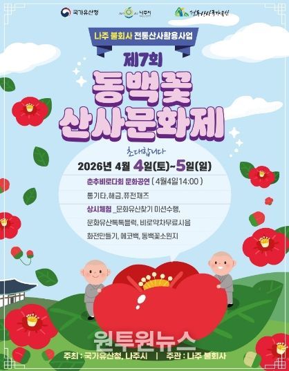 2일 나주시에 따르면 국가유산청과 나주시가 주최하고 대한불교조계종 불회사(주지 철인스님)가 주관하는 ‘2026년 전통산사 국가유산 활용사업 제7회 동백꽃 산사문화제’가 오는 4월 4일부터 5일까지 이틀간 나주 불회사 일원에서 열린다.