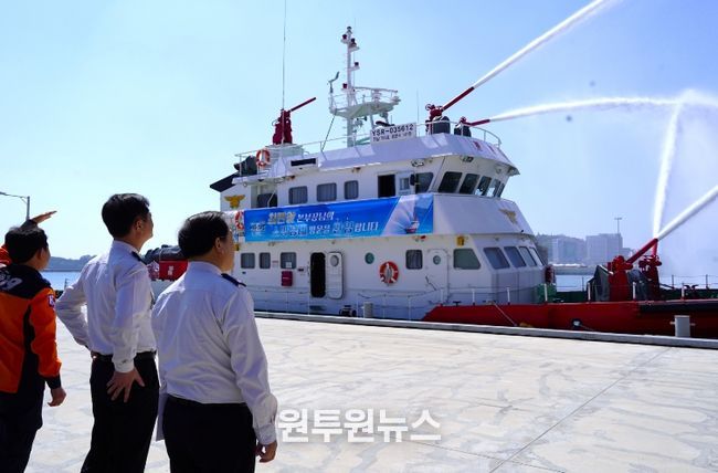 일정 첫 순서로 소방정대를 방문해 전남 해상을 관할하는 소방정 '전남705호'에 승선, 방수포 시연을 참관하고 선박 가동 상태를 직접 살폈다. 24시간 출동 태세를 유지 중인 현장 대원들의 노고를 격려하며 빈틈없는 화재·구조·구급 대응 체계 유지를 당부했다.