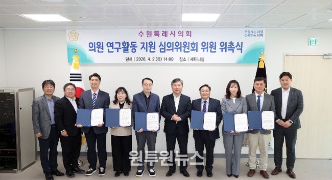 (원투원뉴스) 수원특례시의회는 지난 2일 의회 세미나실에서 수원시의회 의원 연구활동 지원 심의위원회 위원 위촉식을 개최했다.