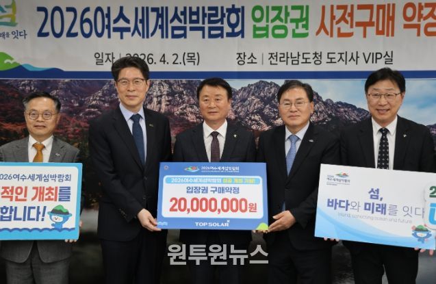 (원투원뉴스) (재)2026여수세계섬박람회조직위원회는 4월 2일 전남도청 VIP실에서 탑솔라㈜와 ‘2026여수세계섬박람회 입장권 구매약정식’을 개최했다고 밝혔다.