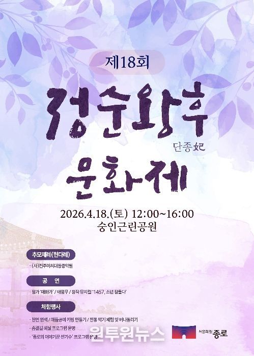 (원투원뉴스) 왕을 잃고도 자리를 지켰던 왕비의 시간이 동망봉에서 다시 흐른다. 종로구(구청장 정문헌)는 4월 18일 12시부터 16시까지 숭인근린공원에서 '정순왕후문화제'를 연다.