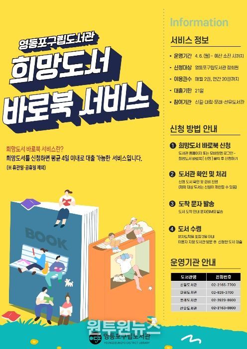 (원투원뉴스) 영등포구가 오는 6일부터 희망도서를 평균 4일 안에 빠르게 받아볼 수 있는 ‘희망도서 바로북’ 서비스를 운영한다고 밝혔다.