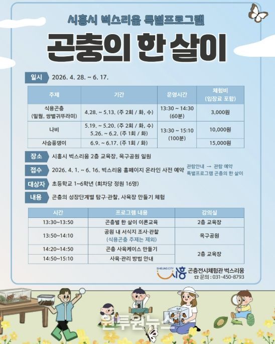 (원투원뉴스) 시흥시 곤충체험전시관 ‘벅스리움’은 오는 4월 28일부터 6월 17일까지 초등학생을 대상으로 특별프로그램 ‘곤충의 한 살이’를 운영한다.