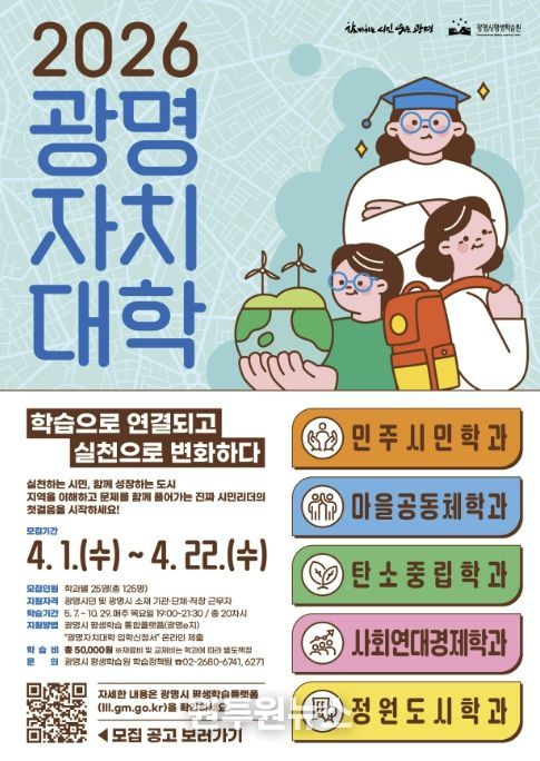 (원투원뉴스) 광명시가 시의 핵심의제인 평생학습 마을리더 양성과정 ‘광명자치대학’ 2026년 신입생 125명을 오는 22일까지 모집한다.