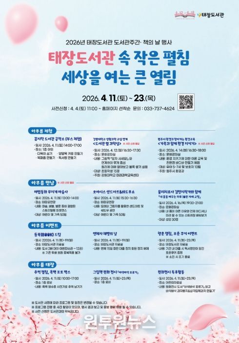 (원투원뉴스) 원주시 태장도서관은 도서관 주간 및 책의 날을 맞이해 오는 11일부터 23일까지 ‘태장도서관 속 작은 펼침, 세상을 여는 큰 열림’을 주제로 다양한 행사를 개최한다.