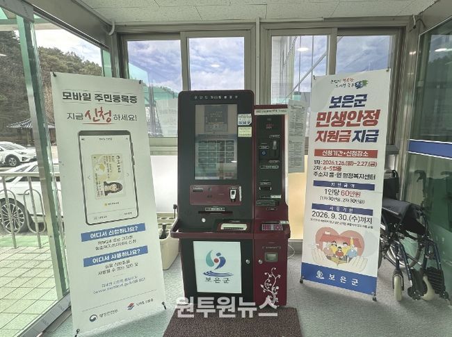 (원투원뉴스) 충북 보은군은 군민 편익 증진과 신속한 행정서비스 제공을 위해 4월 1일부터 삼승면 행정복지센터 민원실 입구에 설치된 무인민원발급기를 24시간 운영한다고 밝혔다.