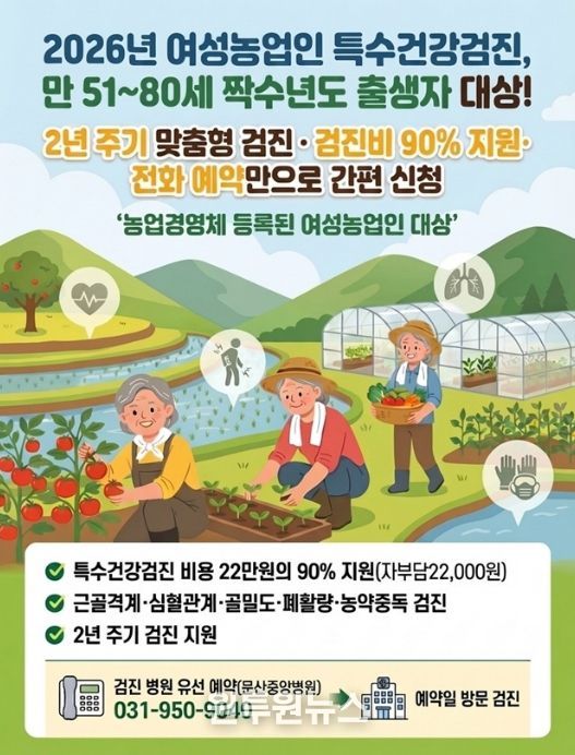 특히 올해부터는 신청 절차를 대폭 간소화해 여성농업인의 편의성을 높였다. 기존처럼 읍면 행정복지센터나 농업기술센터를 방문할 필요 없이, 농림축산식품부 지정 검진기관인 문산중앙병원에 전화로 검진을 예약한 뒤 일정에 맞춰 병원을 방문하기만 하면 된다.