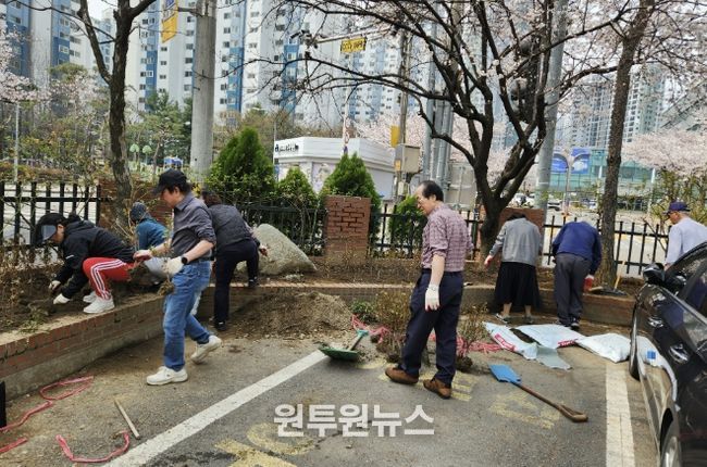 (원투원뉴스) 수원시 장안구 정자2동 기로경로당은 지난 1일, 봄을 맞아 어르신들이 직접 경로당 화단을 정리하고 꽃과 나무를 심었다.
