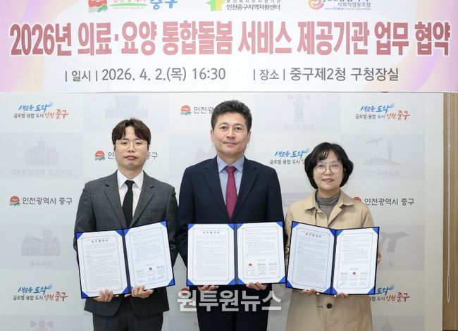 (원투원뉴스) 인천시 중구는 촘촘하고 든든한 ‘지역사회 통합돌봄망’ 구축을 위해 지난 2일 제2청 구청장실에서 복지 서비스 제공기관, 의료기관과 잇따라 업무 협약을 체결했다고 밝혔다.