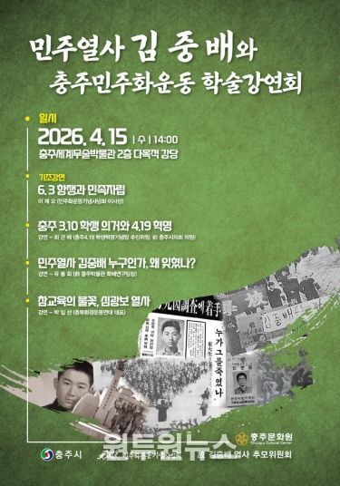 (원투원뉴스) 충주문화원(원장 유진태)은 ‘민주열사 김중배와 충주 민주화 운동’ 이라는 주제로 오는 15일(수) 오후 2시 충주세계무술박물관 2층 다목적강당에서 학술강연회를 개최한다.