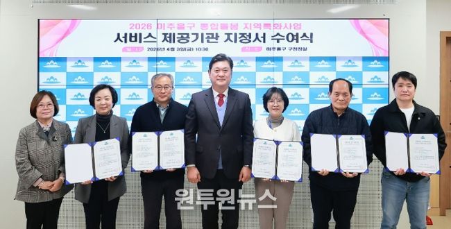 (원투원뉴스) 인천 미추홀구는 3일 구청장실에서 ‘2026년 미추홀구 통합 돌봄 지역특화 사업을 수행할 서비스 제공기관 5곳에 지정서를 수여했다고 밝혔다.