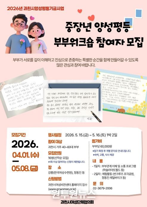 (원투원뉴스) 과천시는 중장년 부부의 건강한 관계 형성과 양성평등한 가족문화 확산을 위해 ‘중장년 양성평등 부부워크숍’을 추진하며, 참여자를 모집 중이라고 3일 밝혔다.