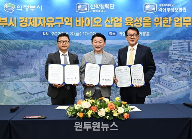 (원투원뉴스) 의정부시는 4월 3일 시청 회룡홀에서 가톨릭대학교 의정부성모병원, 가톨릭대학교 산학협력단과 함께 ‘의정부시 경제자유구역 바이오 산업 육성을 위한 업무협약’을 체결했다.