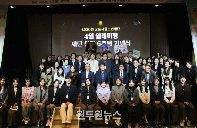 (원투원뉴스) 군포시청소년재단은 4월 3일 군포시청소년수련관 청소년어울림극장에서 4월 월례미팅을 열고, 창립 6주년을 맞아 미래도약 의지를 다지는 자리를 마련했다. 이날 행사에는 군포시청소년재단 임직원, 화용선차예문화연구소 등 80여 명이 참석했다.