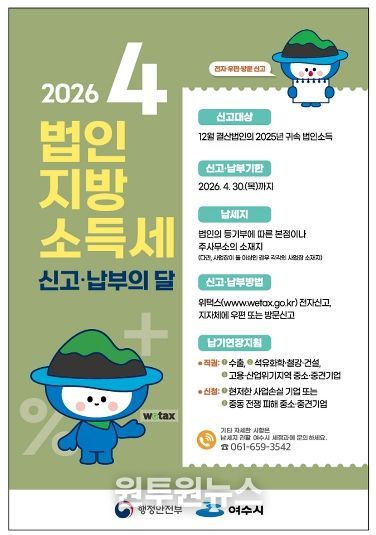 (원투원뉴스) 여수시는 4월 한 달간 ‘2025년 귀속 법인지방소득세에 대한 집중 신고·납부 기간’을 운영한다고 밝혔다.