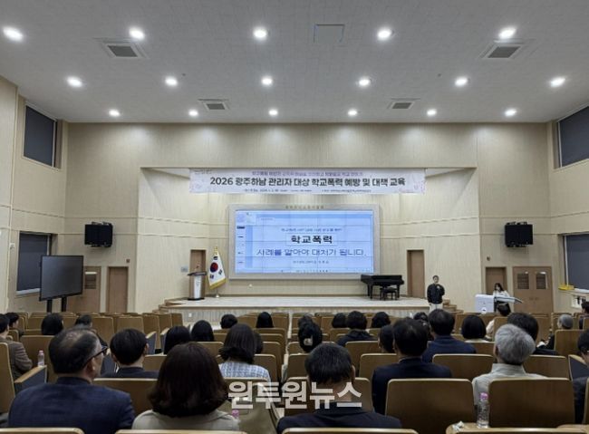 (원투원뉴스) 광주하남교육지원청은 4월 3일 광주하남교육지원청 대강당에서 관내 초·중·고·특수학교 및 각종학교 교장과 교감을 대상으로 ‘2026 관리자 대상 학교폭력 예방 및 대책 교육’을 실시했다.
