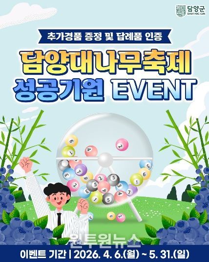 (원투원뉴스) 담양군이 ‘제25회 담양대나무축제’의 성공적인 개최를 기원하고 고향사랑기부 참여 문화를 확산시키기 위해 4월 6일부터 특별 이벤트를 진행한다.