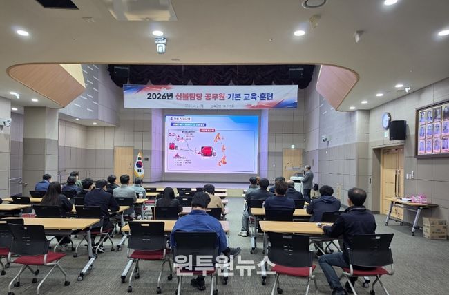 (원투원뉴스) 고흥군은 지난 2일 군청 우주홀에서 군·읍면 산불담당 공무원 35명을 대상으로 ‘2026년 산불담당 공무원 기본 교육·훈련’을 실시했다고 밝혔다.