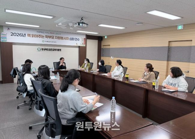 (원투원뉴스) 경상북도김천교육지원청은 4월 3일 김천교육지원청 회의실에서 관내 책 읽어주는 학부모 자원봉사자를 대상으로 '2026년 책 읽어주는 학부모 자원봉사자 심화 연수'를 실시했다.