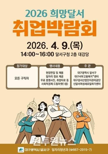(원투원뉴스) 대구 달서구는 구직자와 기업을 연결하는‘2026 희망달서 취업박람회’를 4월 9일 오후 2시부터 4시까지 구청 2층 대강당에서 개최한다.