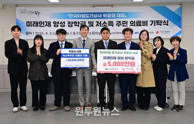(원투원뉴스) 박윤희 한국타일도기상사 대표는 지난 3일, 지역의 미래를 짊어질 인재 양성과 의료사각지대 해소를 위한 성금 1억원을 동구청에 기탁했다.