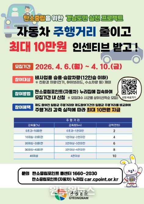 (원투원뉴스) 경상남도는 6일부터 10일까지 자동차 주행거리 감축 실적에 따라 인센티브를 지급하는 ‘자동차 탄소중립포인트제’ 참여자를 추가 모집한다고 밝혔다.