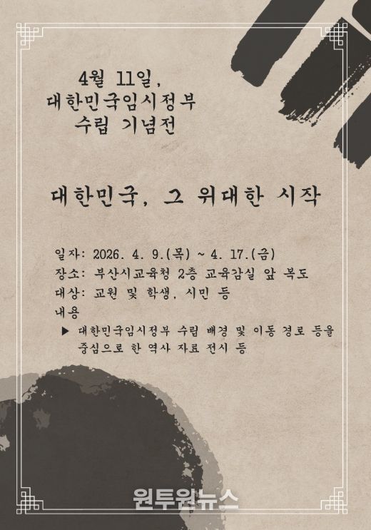 (원투원뉴스) 부산광역시교육청은 오는 9일부터 17일까지 교육청 2층 갤러리에서 ‘대한민국, 그 위대한 시작 - 4월 11일, 대한민국임시정부 수립 기념전’을 개최한다고 밝혔다.